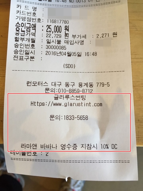 EVENT 3탄!!! 대구 인도퓨전요리점 라마앤바바나 수성점에서 식사 후 영수증을 지참하시면 글라루스 전문시공점에서 썬팅시 10% DC 를 해드립니다. 수성못 바로앞에 있어 경치를 즐기시며 맛있게 식사하시고 고성능 프리미엄 필름인 글라루스를 아주 착한 가격에 시공하시길 바랍니다.